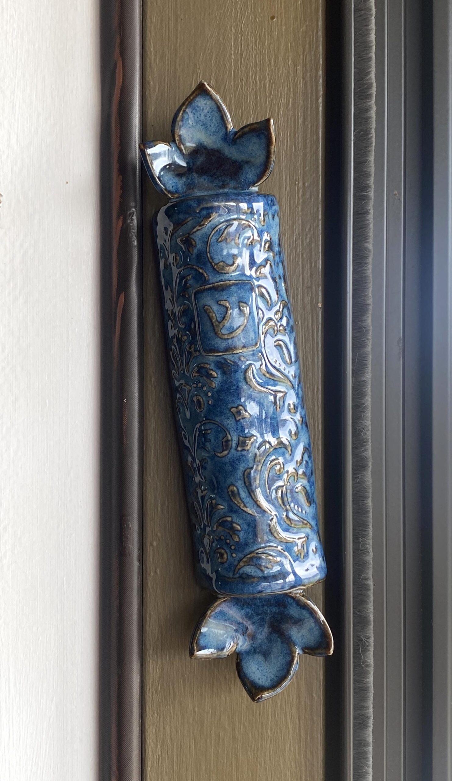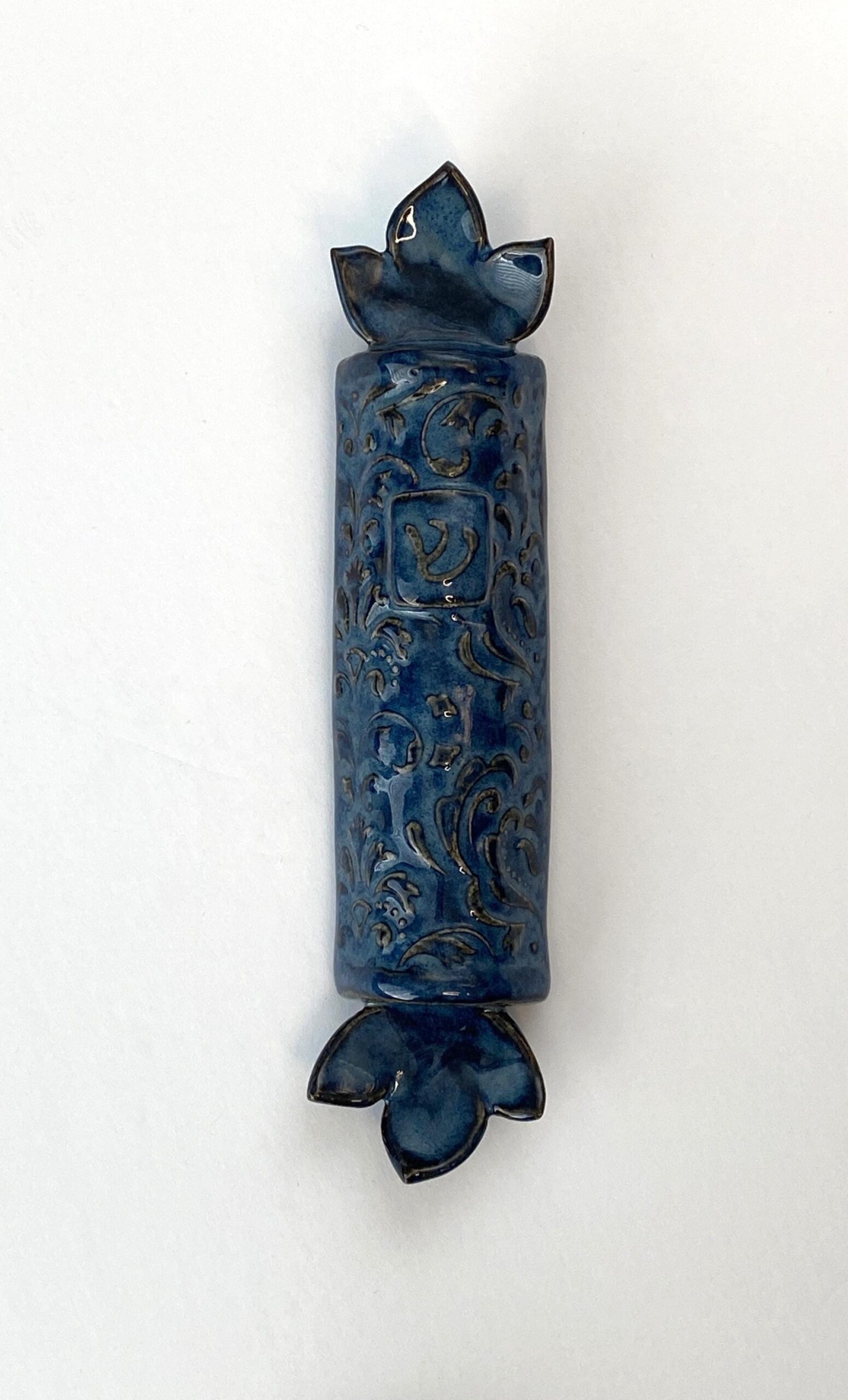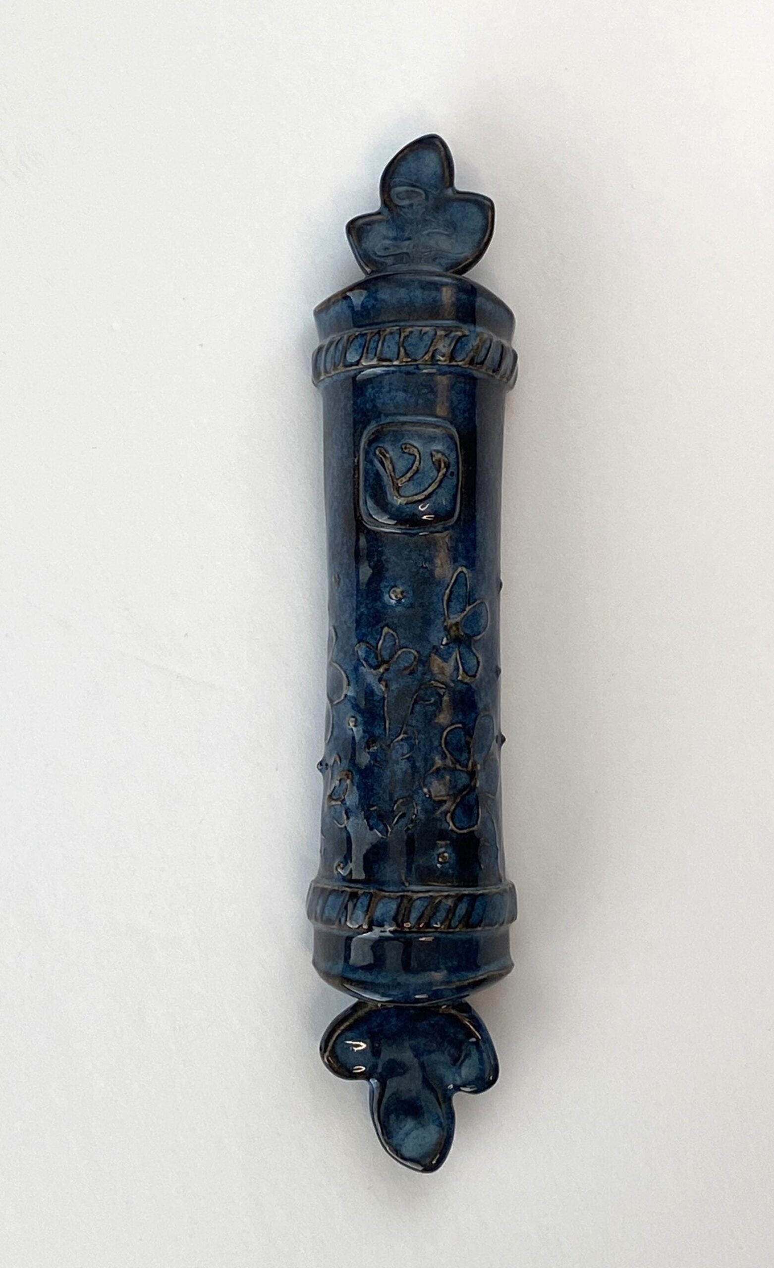 This mezuzah features a blue textured glaze inspired by natural stone and traditional Judaica design motifs. A raised shin symbol is included as a reminder of the Shema and covenant of faith traditionally placed at the entrance of a Jewish home.